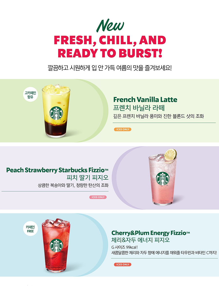 ‘체리&자두 에너지 피지오’ 역시 무더위에 지친 에너지를 끌어올릴 수 있는 제품으로 선택됐다. 이 음료는 지난 4월 두 번째 봄 시즌 음료로 약 한 달간 선보였던 음료로, 새콤달콤한 체리와 자두 풍미를 시원하게 즐길 수 있어 인기를 얻으며 약 100만 잔 판매됐다. 톨 사이즈 기준 타우린 1,000mg, 비타민C 50mg, 비오틴 30ug 등 일일 권장 섭취량에 해당하는 영양소가 들어있으며, 중간 크기인 그란데 사이즈 기준 99kcal로 칼로리가 낮다. 또한 카페인이 없어 건강관리 트렌드에 안성맞춤인 음료이기도 하다.