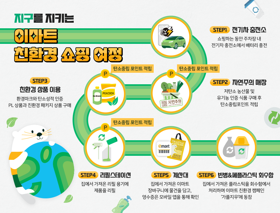 이마트에 도착해 장을 보고 계산대를 거쳐 나오는 그 순간까지, 이마트 쇼핑 여정에 스며든 친환경 소비문화를 한 장에 담아봤다.