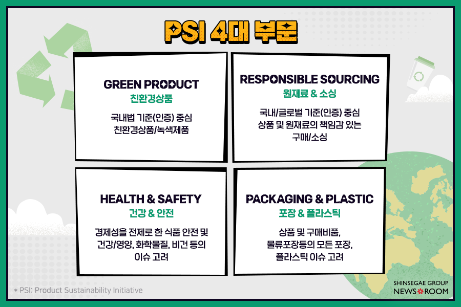PSI를 기반으로 이마트는 지속가능한 상품의 영역을 4대 부문 [①친환경상품 ②책임 있는 원재료 소싱 ③건강•영양/안전 상품 ④포장&플라스틱] 으로 나누고, 부문별 과제 개선을 위한 노력을 기울이고 있다. .