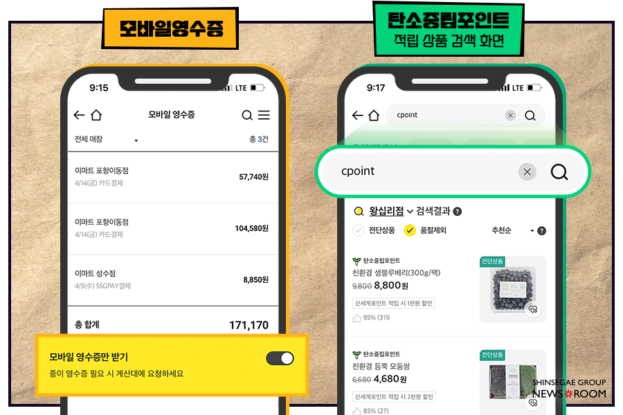 이마트 계산대 앞에서 “영수증 버려주세요”는 이제 옛말이 됐다. 2017년 이마트는 업계 최초로 모바일 영수증 앱서비스를 출시했다. 지금까지 모바일 영수증 서비스를 신청한 고객수는 약 500만 명, 국민 10명 중 1명이 동참하는 셈이다. 이를 통해 절감한 종이 영수증의 양은 누적 2억 8천만 장에 이른다. 이는 20년산 소나무 17만 5천여 그루가 1년간 흡수하는 탄소의 양이다.