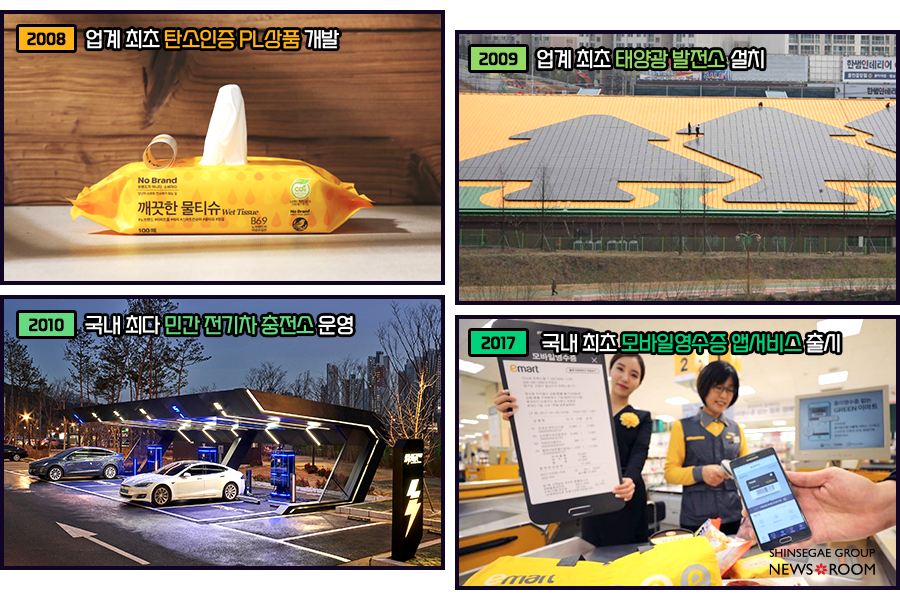 ‘국내 최초 할인점’ 이마트는 친환경 경영에 있어서도 지난 30년간 최초의 역사를 이어 왔다. 업계 최초로 ‘탄소발자국 인증*’을 받은 PL 상품을 출시하는가 하면, ‘태양광 발전 시설’과 ‘지열 에너지 시스템’을 점포에 설치해 탄소 배출 저감을 위해 노력해왔다. 또 ‘비닐 쇼핑백’과 ‘종이 영수증’ 없는 점포를 선보이고, ‘전기차 충전소’를 운영하며 이마트를 찾는 고객이 자연스럽게 친환경 활동에 동참할 수 있는 환경을 조성하고 있다. 당시엔 파격적인 시도였지만, 지금은 하나의 ‘문화’로 자리잡은 활동들이다.
