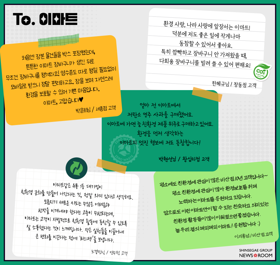 지난 上편에서는 이마트가 30년간 펼쳐온 친환경 활동과 고객과 함께 만들어 온 친환경 소비 문화에 대해 간략하게 살펴보았습니다. 이와 함께 이마트 안에서 지속가능한 내일을 만들어가기 위해 노력 중인 4명의 친환경 히어로도 함께 만나보았는데요!