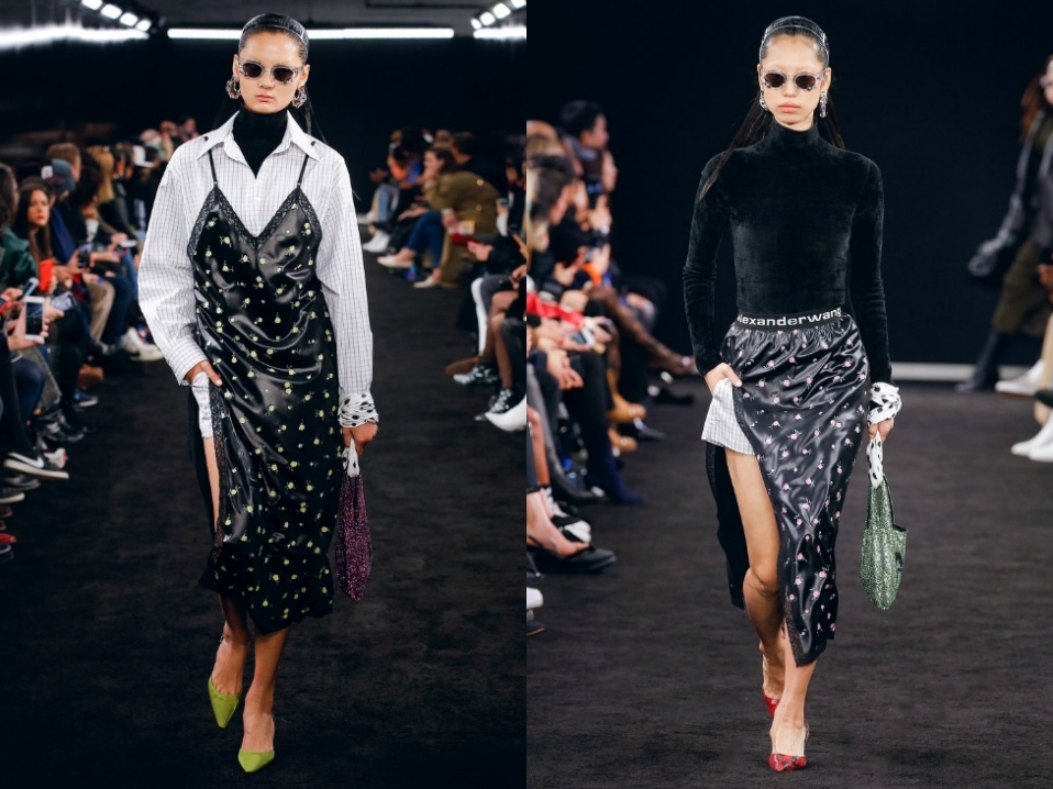 알렉산더왕(alexanderwang)은 올 가을 셔츠와 원피스가 레이어드 된 롱 슬립 드레스를 선보였다. 체크 패턴의 화이트 면 셔츠에 광택감 있는 롱 블랙 드레스가 겹쳐진 형태로, 여유로우면서 동시에 도발적인 매력을 선사한다.