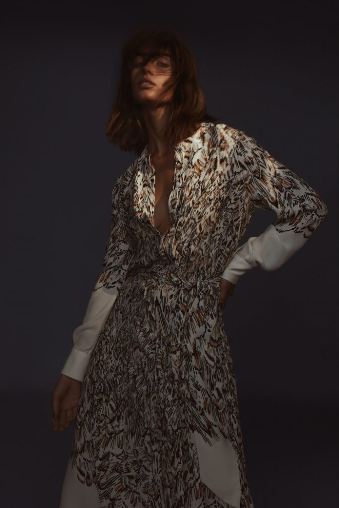 또한 깃털 패턴의 롱 셔츠 원피스는 캐주얼하면서 동시에 감각적인 멋을 더한다. 블루 톤의 그라데이션이 화사한 플리츠 스커트와 하단의 레이스 장식이 여성스러운 롱 블랙 스커트도 함께 선보인다.