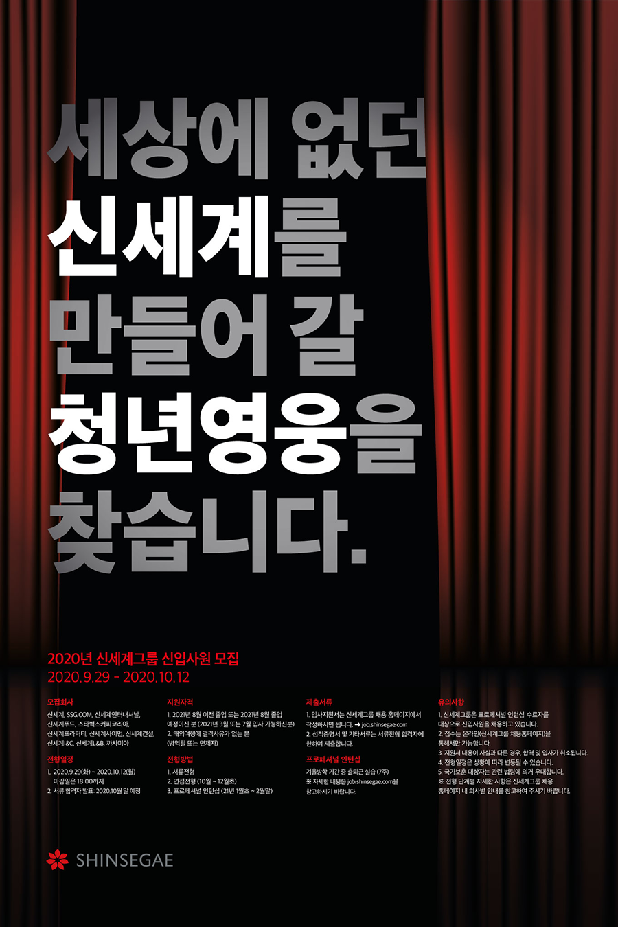 신세계그룹과 함께 세상에 없던 신세계를 만들어 갈 청년영웅을 찾습니다. 대학생 여러분의 많은 관심과 지원 부탁 드립니다.