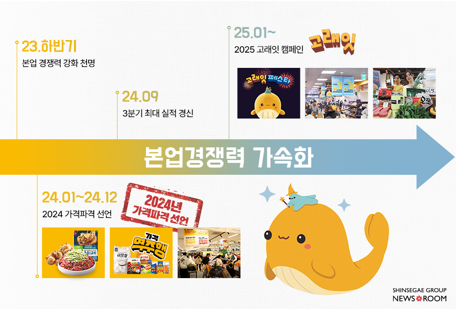 ‘가격파격’으로 본업 경쟁력을 회복한 이마트는, 지난해 말 2025년을 관통할 새로운 캠페인 ‘고래잇 캠페인’을 예고했다. 단순히 가격만 저렴한 게 아닌 상품, 행사, 브랜드 모든 것이 새로워진 이마트를 지향한다. 그리고 이를 통해 본업 경쟁력을 가속한다는 것이 이마트의 목표다.