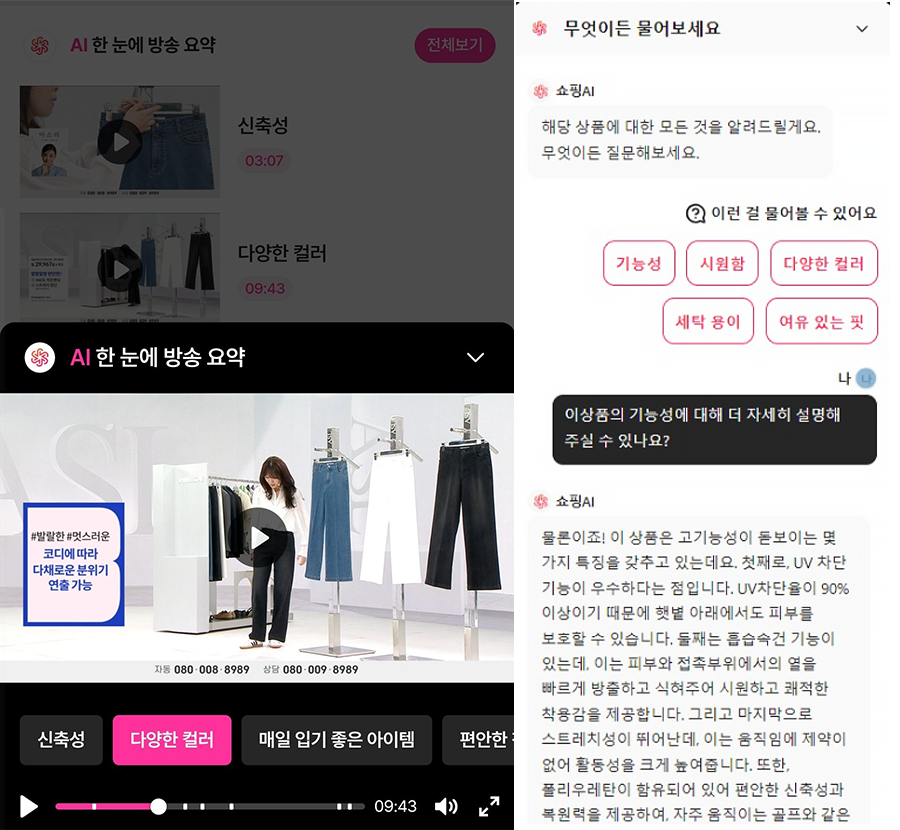 고객들은 ‘AI 한눈에 방송 요약’ 서비스를 통해 긴 방송 화면에서 원하는 내용이 들어가 있는 부분만 골라볼 수 있게 됐고, 방송을 분석한 ‘쇼핑 AI’ 서비스를 통해 해당 상품의 어떤 궁금한 내용도 다 물어볼 수 있다.