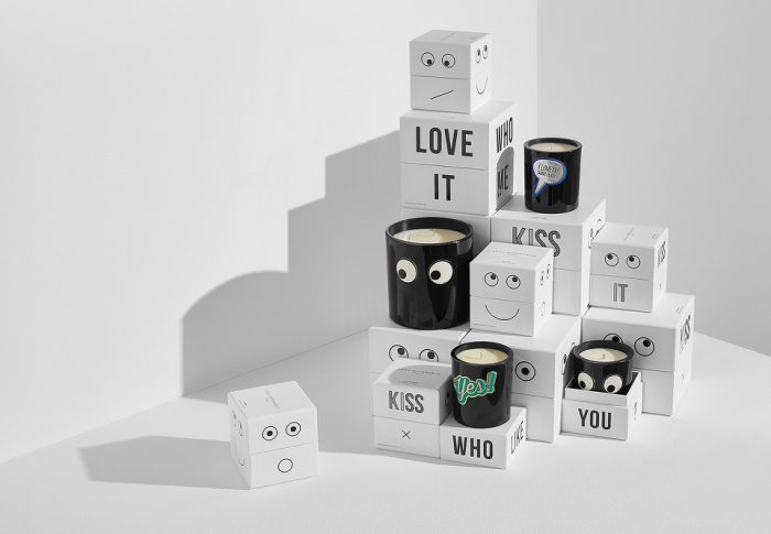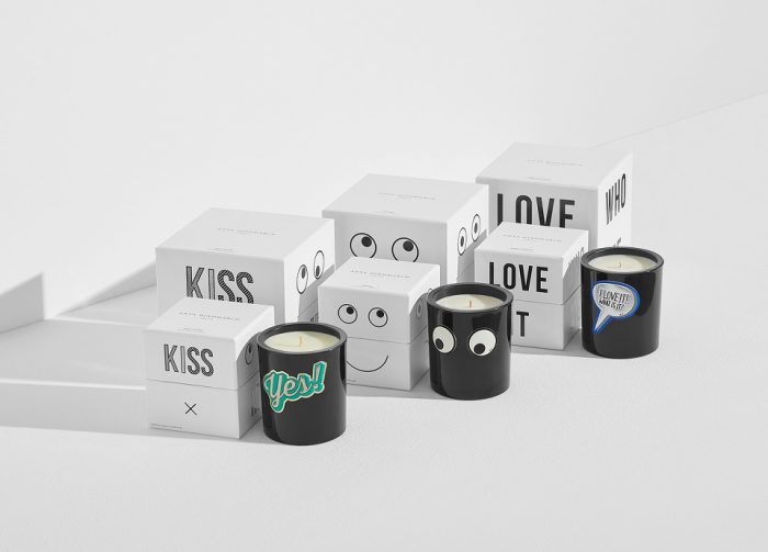 이번 향초 컬렉션은 최고의 원재료를 사용해 영국에서 전통적 방식으로 수작업 해 더욱 특별하다. 향초의 케이스에는 안야 힌드마치만의 재치와 유머를 드러내는 스티커 디자인이 적용됐다. ‘굴러가는 듯한 눈알’그래픽과 ‘yes!(그래!)’ ‘I love it! What is it?(마음에 들어!그게 뭐지?)’와 같은 문구 레터링이 재미를 더한다.