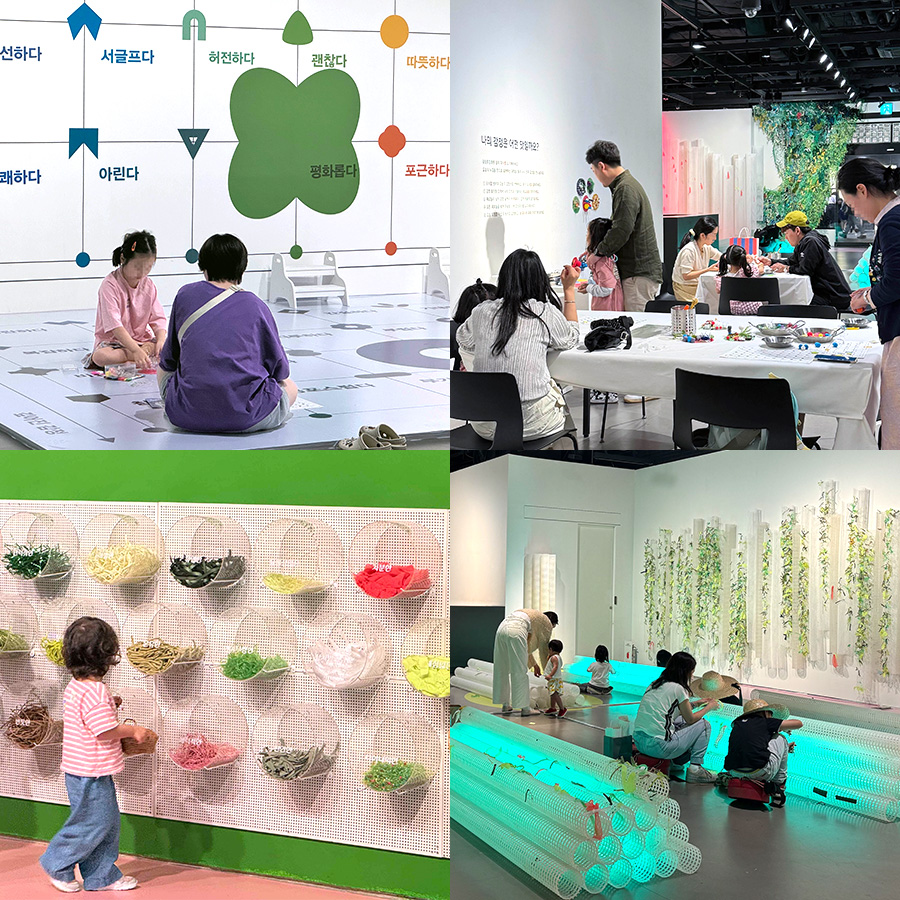 벽과 바닥에 쓰여진 감정 단어를 보며 아이들은 자신의 감정이 어디쯤 위치하는지 표현해보기도 하고, 다양한 촉감을 가진 재료들을 이용해 갤러리 내부의 초록 정원을 직접 채워나가 볼 수도 있다.