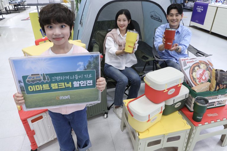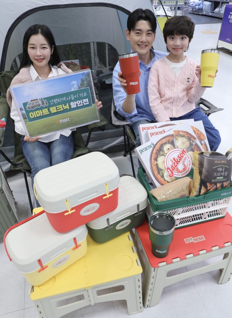 4월 9일 목요일 오전 이마트 청계천점에서 모델들이 ‘캠크닉’ 특가 할인 상품을 소개하고 있다. 이마트는 4월 15일(수)까지 캠핑·아웃도어 브랜드 ‘시티 피크닉(City Picnic)’ 14종 신상품을 선보이고, 신세계포인트 적립 시 전 품목 20% 할인 혜택을 제공한다. 대표적으로 ‘시티피크닉 테이블’은 7,920원에, ‘시티피크닉 폴딩카트’는 31,920원에