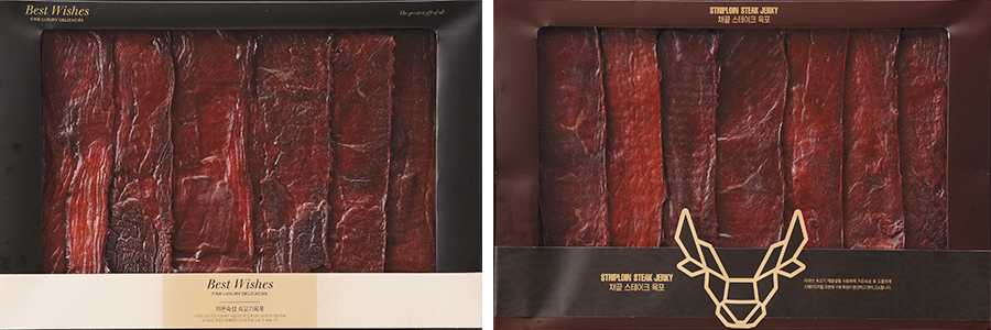 ‘채끝 육포세트’도 인기다. 전통적으로 육포는 소의 우둔살이나 홍두깨살로 만들어 질긴 식감을 갖는 반면에, ‘채끝 육포세트’는 소의 채끝을 사용, 저온 숙성 한 뒤 오븐에 구워 부드럽고 고소한 것이 특징이다. 가격은 66,000원으로 14대 카드 할인 시 59,400원에 구매할 수 있다.