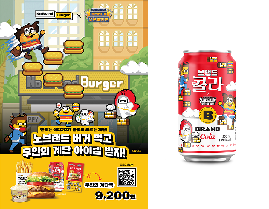 먼저 신세계푸드는 노브랜드 버거 전용 음료인 ‘브랜드 콜라’ 패키지에 버거버거, 싸개 등 자체 캐릭터를 ‘무한의 계단’ 테마로 디자인해 적용한 스페셜 에디션 50만개를 선보인다. 특히 ‘브랜드 콜라 무한의 계단 에디션’ 패키지에는 노브랜드 버거 전용으로 개발한 ‘무한의 계단’ 게임을 즐길 수 있는 QR코드를 삽입해 단순히 마시는 재미를 넘어 즐기는 재미를 더했다.