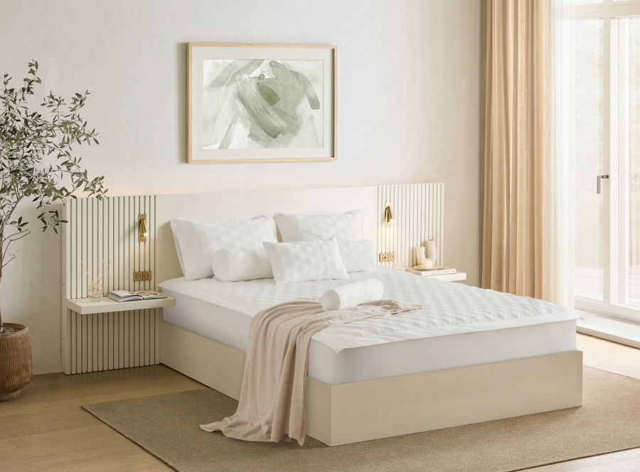 디자인 측면에서도 까사미아만의 감각을 살렸다깔끔하고 세련된 다이아몬드 패턴과 깨끗한 화이트 컬러를 적용해 다양한 인테리어 스타일과 자연스럽게 어우러지며가장자리는 면 100% 원단으로 덧대어 마감해 내구성을 높이고 피부 자극을 최소화했다.