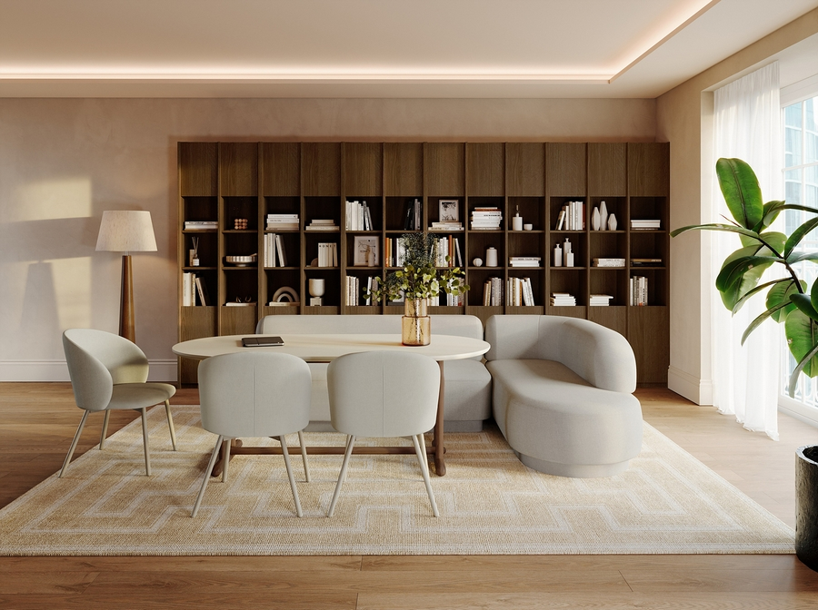 알로는 거실이 휴식 · 식사 · 업무를 아우르는 다목적 공간으로 진화하는 ‘리빙다이닝’ 트렌드에 주목한 제품이다. 일반 다이닝 테이블보다 50mm 낮은 테이블 높이와 소파형 벤치 · 체어로 구성되는 모듈 구조로 주방, 거실 등 가족이 함께하는 다양한 공간에서 유연하게 활용할 수 있다.