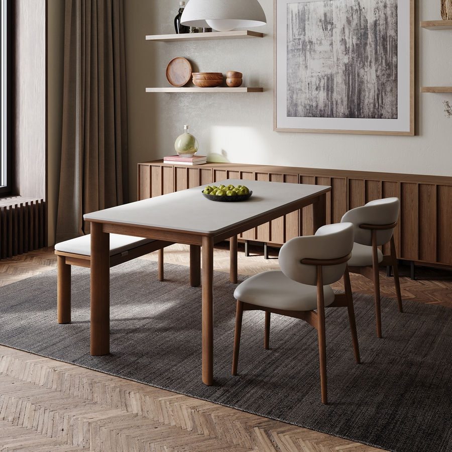 발수 · 방오 기능성 패브릭을 적용해 음식물 오염에 강하고, 미드 브라운 원목 다리와 라이트그레이 세라믹 상판의 조합으로 감각적인 공간 연출이 가능하다. KS 기준 내구성 테스트와 국가공인 인증기관의 소재 안전성 검증도 완료했다.