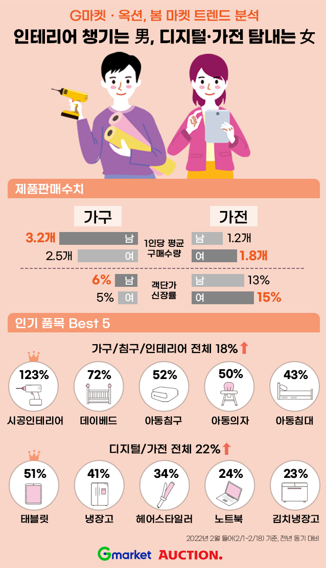 지마켓글로벌, ‘봄 쇼핑 동상이몽’… 인테리어 챙기는 男, 디지털·가전 탐내는 女