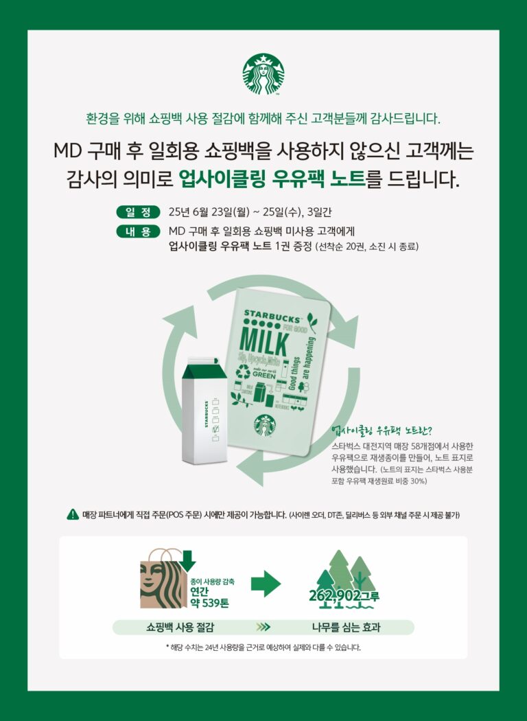 지구를 위한 가치 있는 같이 스타벅스, 우유팩 업사이클링 노트 증정