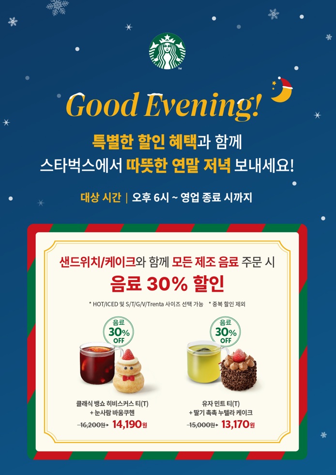 “음료와 푸드 함께 구매하고 혜택 받아볼까?” 올해 연말 모임은 스타벅스에서! 스타벅스, ‘굿 이브닝’으로 음료 30% 할인