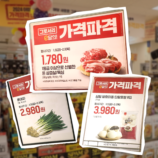 고물가 시대, 장바구니 물가 안정을 위한 이마트의 가격파격 선언! 매달 식품류 3개 품목을 선정하여 한 달 내내 초저가로 판매하고 고객 구매빈도가 높은 생필품 40개 품목을 선정하여 월별로 초저가로 판매합니다 2024 가격파격 선언을 시작으로 펼쳐질 이마트의 할인 행사들, 놓치지 마세요!