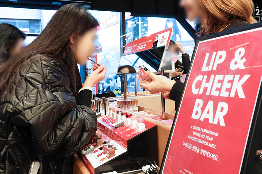 1층 매장에 들어서면 ‘립&치크바’가 고객을 맞이한다. 20여 가지 립, 치크 인기브랜드를 선보이며 최신 메이크업 트렌드를 경험할 수 있도록 했고 2층에는 외국인들이 많이 찾는 스킨케어, 퍼품, 헤어바디 존을 마련했다.