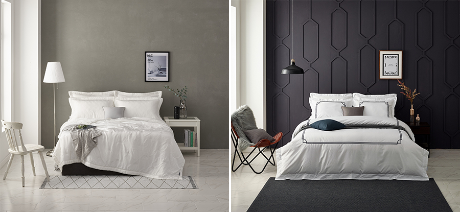 60수 면 100%의 베딩 제품으로 흡수력이 좋아 쾌적하고 편안한 숙면을 선사하며 홀 이불커버, 면 패드, 베개 커버로 구성, 자수 컬러는 골드 또는 네이비 두 가지 옵션 중 선택할 수 있다.