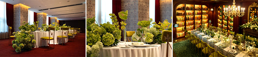 고풍스러운 파리의 살롱과 서재에서 영감을 받아 설계된 라이브러리는 벽면을 가득 채운 프랑스에서 직접 공수한 1,400여 권의 고서들이 빚어낸 클래식한 분위기가 돋보이는 공간으로 여기에 화려함이 돋보이는 감각적인 플라워 장식과 라이브 밴드 연주가 어우러져 영화 속 한 장면 같은 웨딩의 순간을 연출했다.