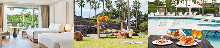이국적인 야자수 아래 펼쳐진 풀 사이드에서 시원한 가을 바람을 맞으며 풀 사이드 바 잇투오(EAT2O)의 대표 메뉴(베이컨 치즈버거&감자튀김, 피자, 한라산 오므라이스) 중 1가지와 함께 시원한 음료를 여유롭게 즐길 수 있는 ‘잇투오 풀 사이드 세트’ 이용 혜택도 포함된다.