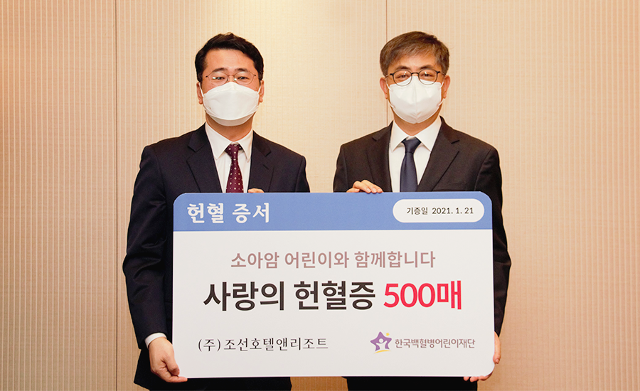 조선호텔앤리조트는 코로나19로 혈액 수급이 더욱 어려워진 소아암 어린이들의 치료를 돕기 위해 헌혈증 기부 캠페인을 진행했으며 이를 통해 모은 헌혈증 500매를 기부했다. 기부한 헌혈증은 한국백혈병어린이재단에서 치료 중인 소외계층 난치병 환아를 위해 사용될 예정이다.