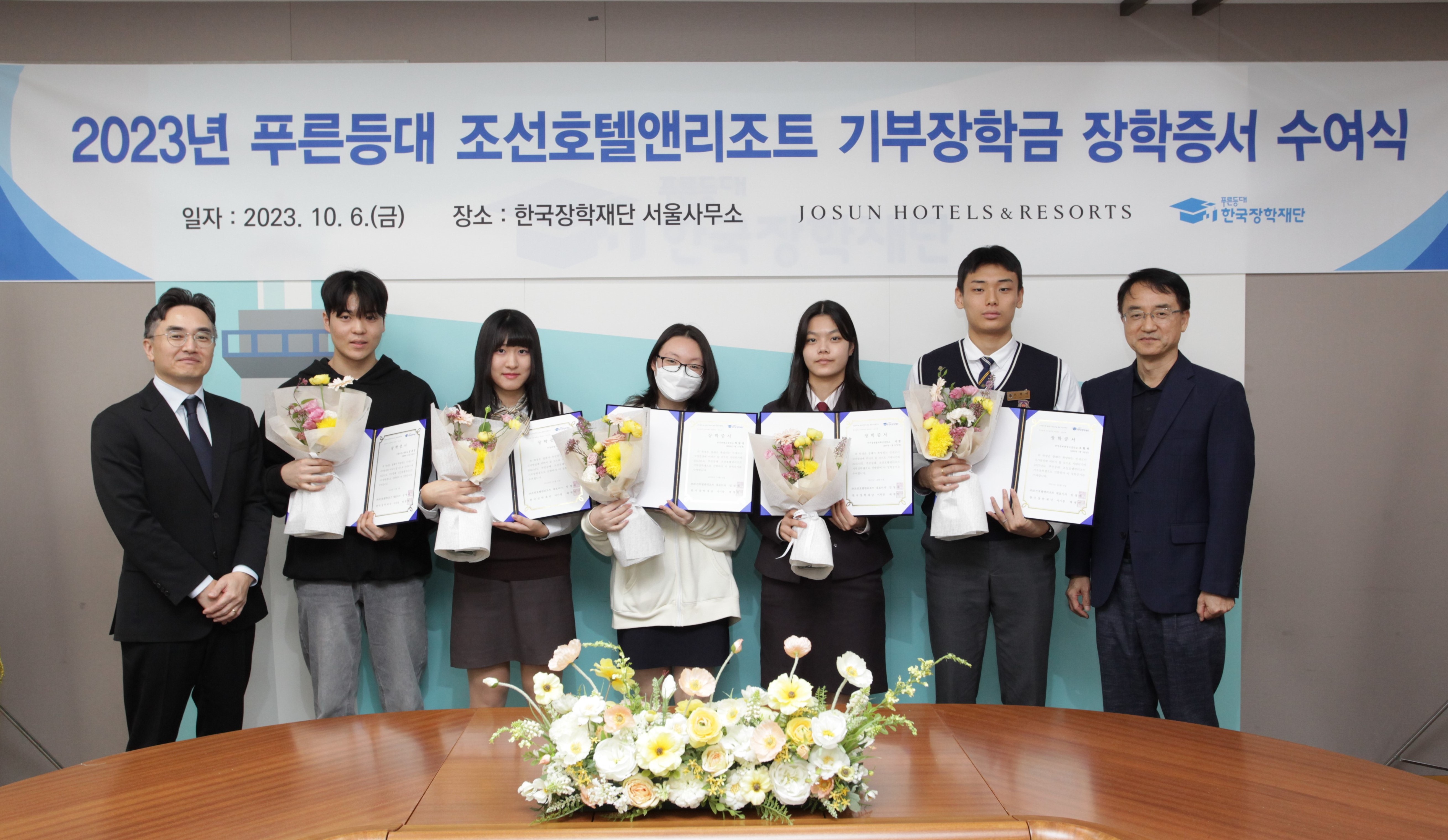 MEDIA 글자 크기 보통 크게 아주 크게 공유하기 페이스북 X 카카오톡 링크 복사 링크 복사됨 도구 보기 이미지 다운로드 조선호텔앤리조트 x 한국장학재단, 2023년 푸른등대 조선호텔앤리조트 기부장학금 장학증서 수여식 개최 2023.10.10 조선호텔앤리조트