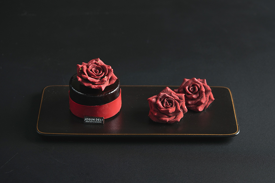 ‘스윗 로즈’는 진한 초콜릿 시트 사이에 다크 초콜릿 가나슈와 라즈베리 잼을 샌드한 케이크로, 위에 정교하게 세팅한 장미 모양의 초콜릿을 올려 로맨틱한 비주얼을 자랑한다. 가격은 2만원이며 구매 2일 전 네이버 예약 및 유선(031-539-4814)을 통해 예약 가능하다.