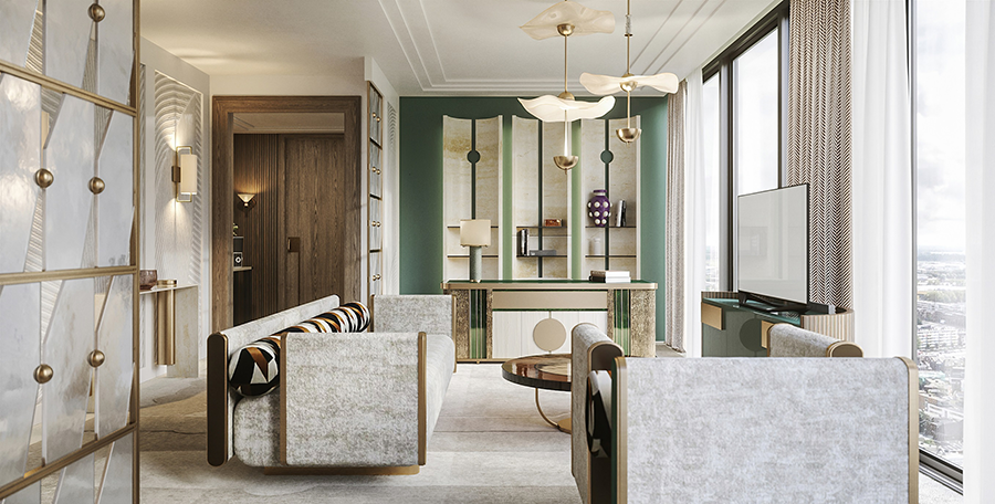 호스피탈리티 업계의 떠오르는 신진 디자이너 듀오로 명성을 떨치고 있는 움베르트&포예(Humbert&Poyet)가 디자인 설계를 맡아 궁전과 최상층의 주거 공간을 뜻하는 ‘팰리스’의 품격을 느낄 수 있도록 다층적인 미를 완성시켰다.