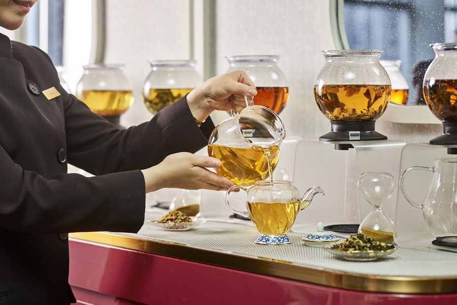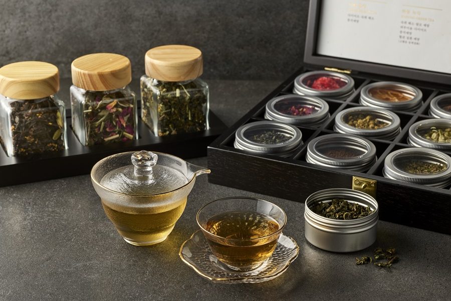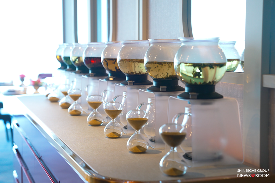 이곳 내부는 화려한 색채를 띈다. 우아한 레드와 골드를 현대적 미감으로 조화롭게 풀어냈다. 고객은 들어오면서부터 식사를 마칠 때까지 블렌딩 티를 직접 선별해 즐길 수 있는 것이 특징이다.