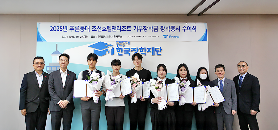 조선호텔앤리조트(대표이사 최훈학)와 한국장학재단(이사장 배병일)이 10월 27일(월), 서울시 중구 한국장학재단 서울사무소에서 ‘2025년 푸른등대 조선호텔앤리조트 기부장학금 장학증서 수여식’을 개최했다.