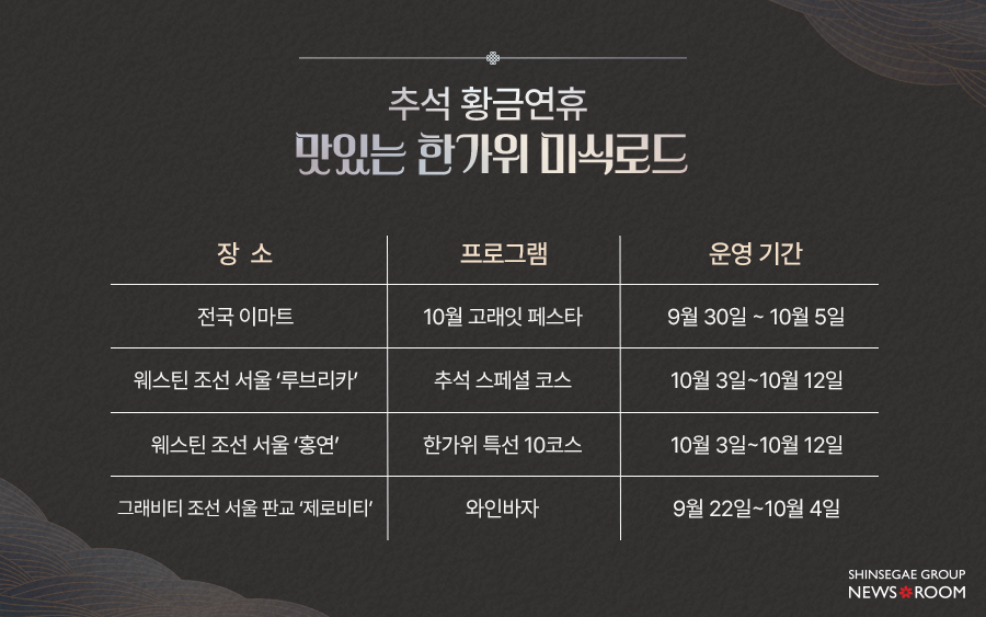 올해, 아니 몇 년 전부터 기다리고 기다리던 그 연휴. 2025년 추석 황금 연휴가 찾아왔습니다. 10월 3일 개천절을 시작으로 주말, 추석 연휴 3일, 대체공휴일, 한글날까지 이어져 최장 10일까지 쉴 수 있는 역대급 연휴죠. 굳이 해외로 떠나지 않아도 좋습니다. 미리 거창한 계획을 세우지 못했어도 괜찮습니다. 신세계그룹이 함께하니까요.