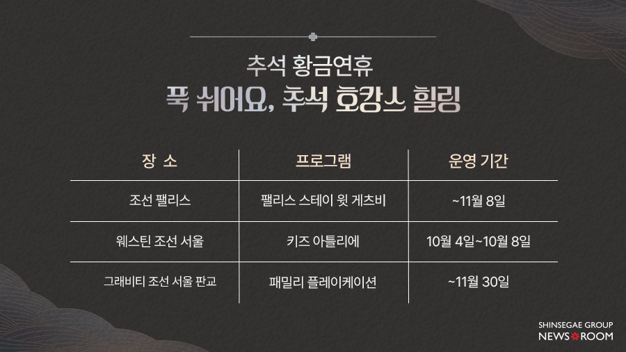 온전한 쉼을 원한다면 ‘호캉스’만한 선택이 없습니다. 조선호텔앤리조트는 연휴 기간, 편안한 휴식을 찾는 고객들을 위해 다채로운 프로모션을 마련했습니다. 멀리 떠나지 않아도 휴양의 즐거움을 누릴 수 있는 도심 속 호텔에서 특별한 한가위를 보내보세요.