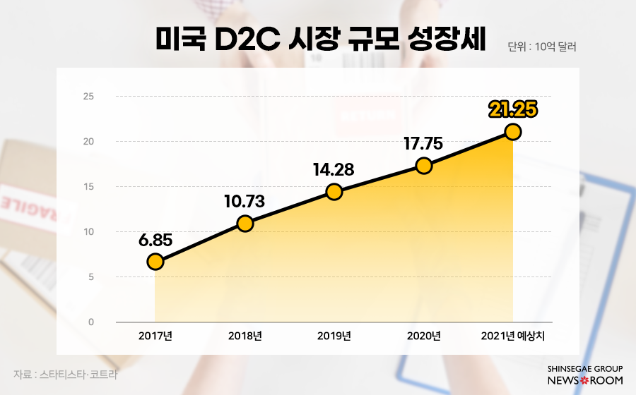 1년 후, 나이키가 발표한 2020년 9~11월 매출은 전년 대비 9% 증가한 112억 달러였다. 그중에서도 D2C 판매는 전년 대비 32% 성장한 43억 달러였다. 코로나 팬데믹의 여파를 감안하면 더욱 성공적인 ‘독립선언’이었다. 나이키를 시작으로 D2C 강화는 그야말로 대세가 되었다. 미국 D2C 시장 규모는 2017년 68억 5천만 달러에서 2021년 212억 5천만 달러로, 약 210% 성장한 것으로 예측했다.