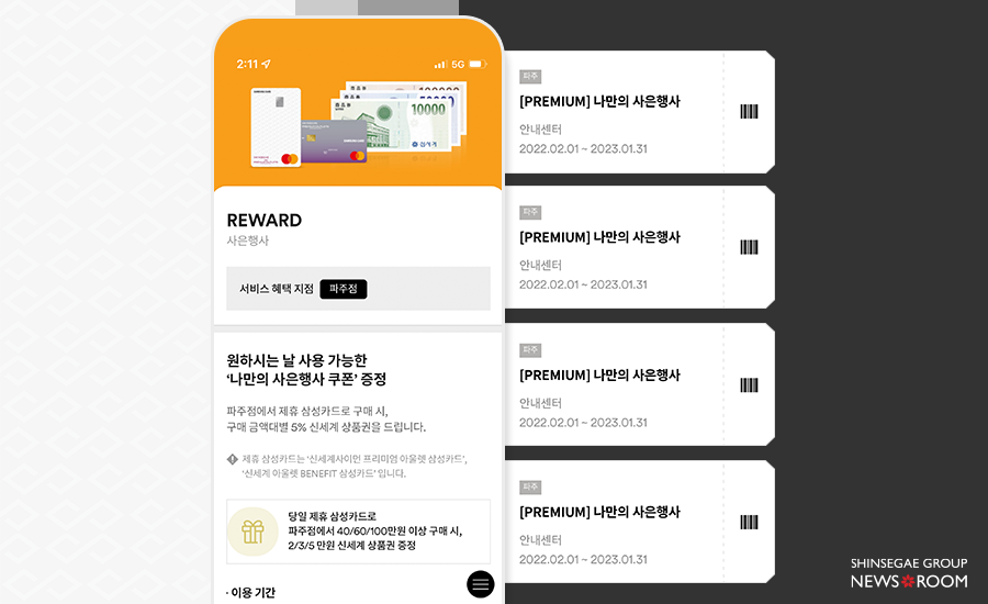 두 번째로 ‘나만의 사은행사’ 스페셜 혜택도 누릴 수 있다. ‘나만의 사은행사’는 ‘고객이 직접 사은행사를 정한다’는 의미로, 방문 당일 점포 사은행사가 없어도 원하는 사은행사에 참여할 수 있는 서비스이다. 행사 기간이나 원하는 시간대에 맞춰 방문하지 못하는 고객들에게 매우 유용하다. ‘신세계아울렛 BENEFIT 삼성카드’로 구매 시, 구매 금액대별 5% 신세계상품권을 받을 수 있는 쿠폰을 연간 5매 증정한다.