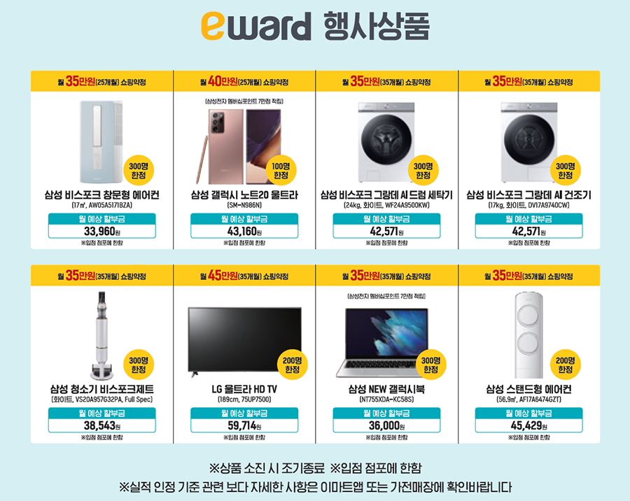 또한 ‘LG 울트라 HD TV(189cm, 월 예상 할부금 59,714원)’는 월 45만원/35개월 약정으로 200대 한정 기획했으며, ‘삼성 NEW 갤럭시북(월 예상 할부금 36,000원)’은 월 35만원/35개월 쇼핑 약정 시 7만원 삼성전자 멤버십 포인트 적립 혜택을 추가 제공한다.