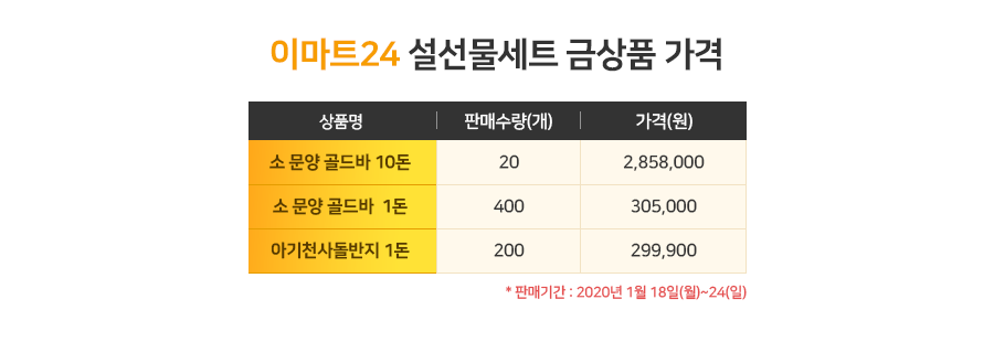 이마트24는 이달 18일부터 24일까지 ‘소 문양 골드바’ 10돈(37.5g) 20세트(세트당 285만8천원) / 1돈(3.75g) 400세트(세트당 30만5천원), ‘아기천사돌반지’ 1돈 200세트(세트당 29만9천9백원) 등 총 3종의 금 선물세트를 선착순 한정 판매한다.