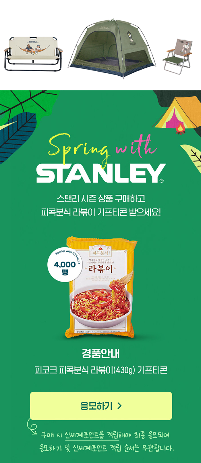 참여방법은 이마트에서 스탠리 시즌상품을 구매하고 신세계포인트 적립 후 이마트앱에 응모를 하면 된다.(응모하기 및 포인트 적립 순서는 무관) 당첨자 발표는 4/8(금)이며 경품 발송일은 4/15(금)이다.