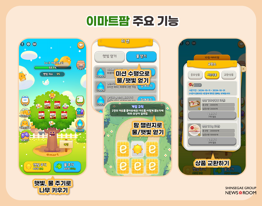 이마트팜에서 보상을 얻기 위한 미션은 출석체크, 전단지 보기, 댓글 달기 등으로 간단하다. 이 밖에도 카드 뒤집기, 행운의 뽑기 등 ‘팜 챌린지’를 통해 쉽고 재미있게 보상을 얻을 수 있도록 기획했다. 실제로 이마트에서 일정 금액 이상으로 장을 보면 최대 보상을 제공하기도 한다.