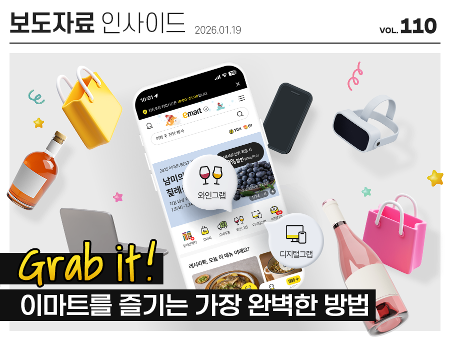 이마트앱이 작정하고 새롭게 태어났습니다. 오더픽, 오더투홈에 이어 스마트 오더의 끝판왕 새단장한 ‘와인그랩’과 ‘디지털그랩’을 장착했다는 사실! 이마트앱이 가져온 이 혁신들이 우리의 쇼핑 일상을 얼마나 편하게 바꿔놓고 있는지 궁금하신가요? 혼자만 알고 있기 아까운 이마트앱의 변화를 특별히 뉴스룸 독자들에게 공개합니다.