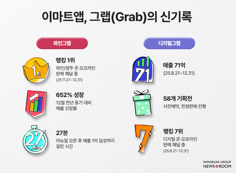 지표도 탄탄합니다. 와인그랩의 2025년 12월 매출은 전년 동기 대비 무려 652% 올랐습니다. 온·오프라인 전체 채널 중에서 와인/양주 분야 매출 1위를 찍었죠. 디지털그랩도 론칭하자마자 누적 고객 1만 명을 돌파하더니 쟁쟁한 대형 오프라인 매장들을 제치고 매출 7위에 안착했습니다.