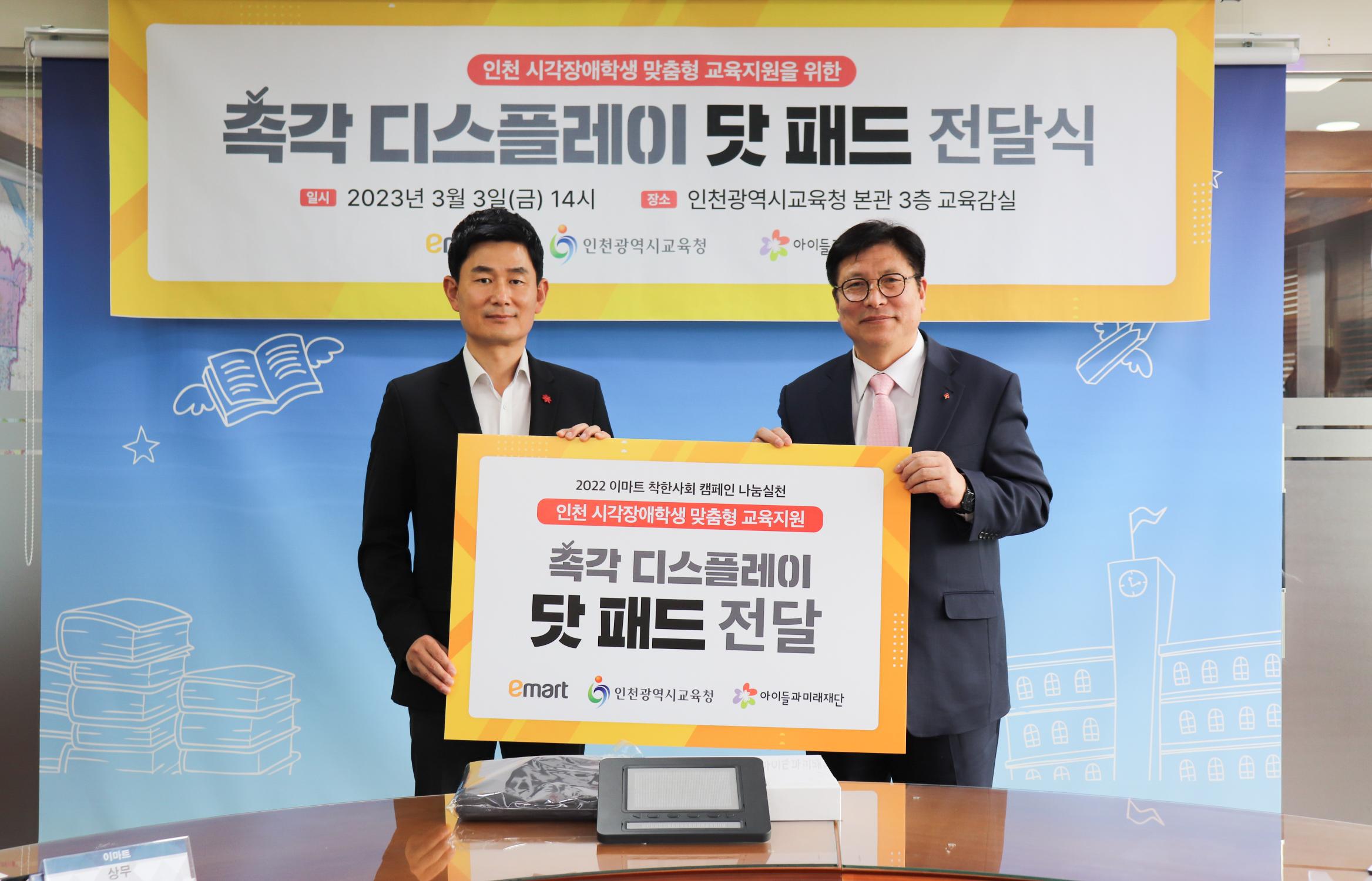 MEDIA 글자 크기 보통 크게 아주 크게 공유하기 페이스북 X 카카오톡 링크 복사 링크 복사됨 도구 보기 이미지 다운로드 이마트, 1억원 상당의 시각장애인용 점자 패드 기부 2023.03.06 이마트