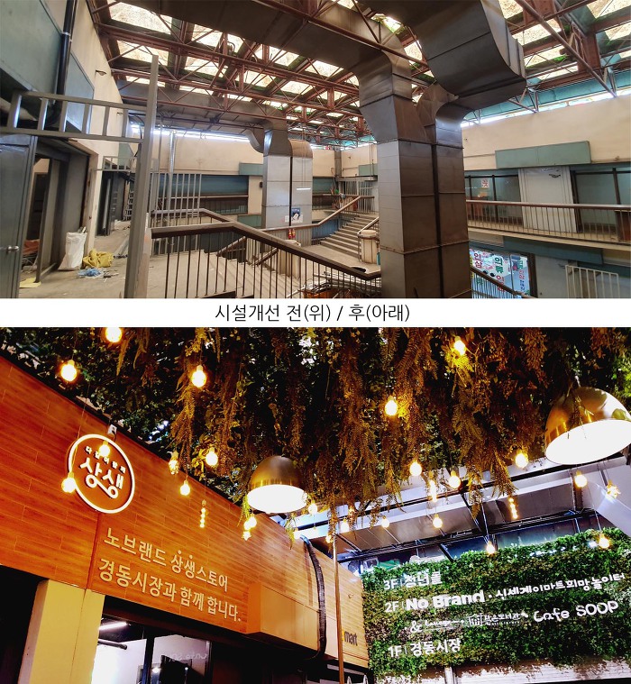 우선 30년차로 노후한 경동시장 신관 건물에 별도의 안전도 검사를 가진 한편 중앙 보이드 계단 공간 등을 깔끔하게 리모델링했다. 또한 노브랜드 상생스토어의 인구 유입 효과에 힘입어 지난 8월말 입점한 청년몰 20곳에 홍보용 디스플레이를 기증했다.
