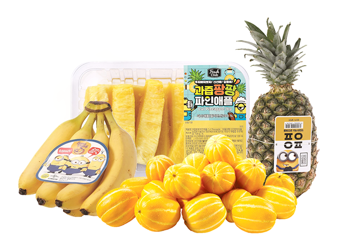 미니언즈와 콜라보한 대표 상품으로 이마트는 참외/바나나/파인애플 등 노란색 과일을 오는 4월29일부터 5월6일까지 8일간 할인 판매한다. 또한 익살맞은 미니언즈 캐릭터가 그려진 고지물과 소품 등을 활용해 매장을 미니언즈 테마로 재단장한다. 본격 제철을 맞이한 ‘성주 참외’는 기존 대비 최대 50% 가량 할인한 개당 1,250/1,000원(280g/220g 내외)에 판매하며, 미니언즈 스티커가 들어있는 ‘바나밸리 바나나’를 행사카드 결제시 20% 할인한 2,384원에, ‘컷 파인애플(1kg)’을 3천원 할인한 6,480원에 준비했다.