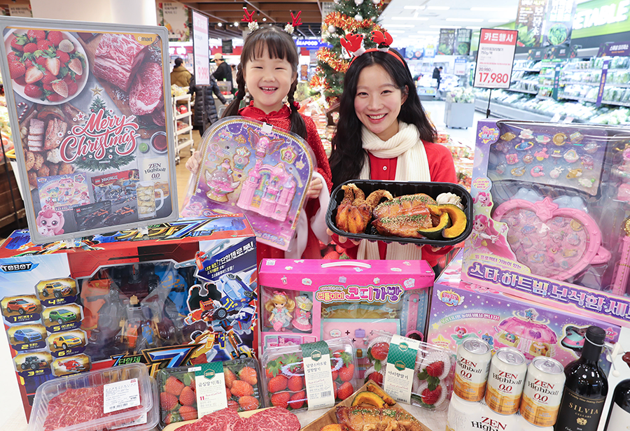 12월 19일 목요일 오전 이마트 용산점에서 모델들이 ‘크리스마스 먹거리·장난감’ 상품들을 소개하고 있다. 이마트는 12월 20일(금)부터 12월 26일(목)까지 일주일간 가족들이 함께 모여 즐길 수 있는 온가족 먹거리 할인 행사에 나선다. 신세계포인트 적립 시 ‘한우 등심/채끝’은  40% 할인, ‘국산의힘 딸기’ 전품목을 신세계포인트 적립 시 3천원 할인한다. 어린이를 위해 25일(수)까지 ‘레고’, ‘슈팅스타 캐치티니핑’ 등 완구 상품 구매 시 신세계상품권 1만원을 증정하는 행사도 펼친다.
