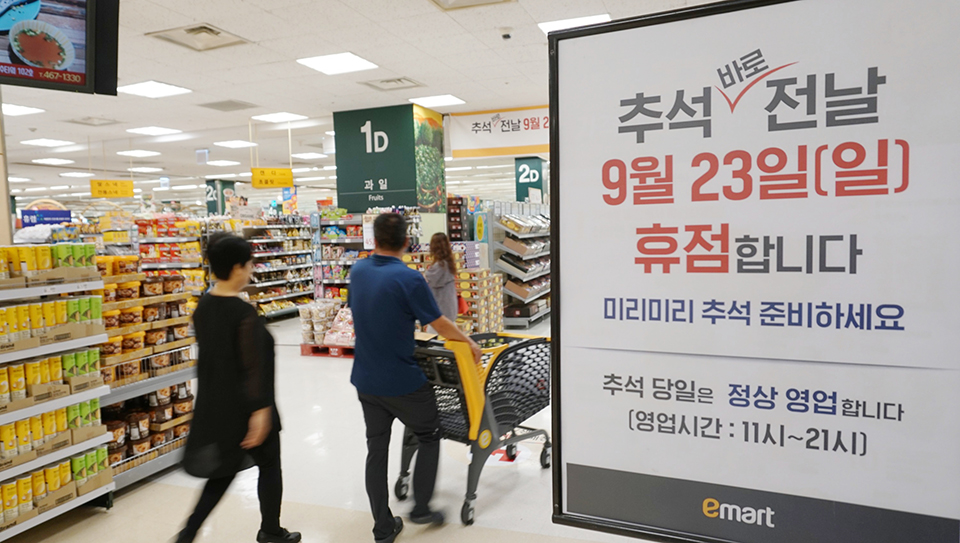2012년 대형마트 의무휴업 도입 이후 추석 바로 전날이 ‘둘째, 넷째 일요일 의무휴업’에 따라 60%가 넘는 이마트 점포가 영업을 하지 않는 것은 올 추석이 처음이다.