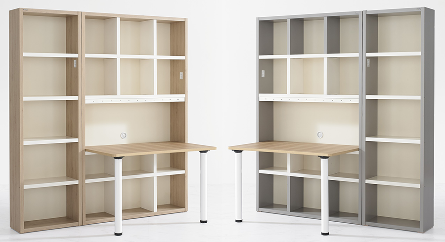 이 제품은 상·하단에 수납 공간이 있는 책상(1200X755X2000mm)과 5단 책장(600X280X2000mm)으로 구성된 상품이며, 세트 상품인만큼 인테리어 효과와 공간 활용도가 높은 것이 특징이다. 두 제품의 차이는 색상 차이이며 우드톤과 그레이톤 중 취향에 맞게 고를 수 있다.