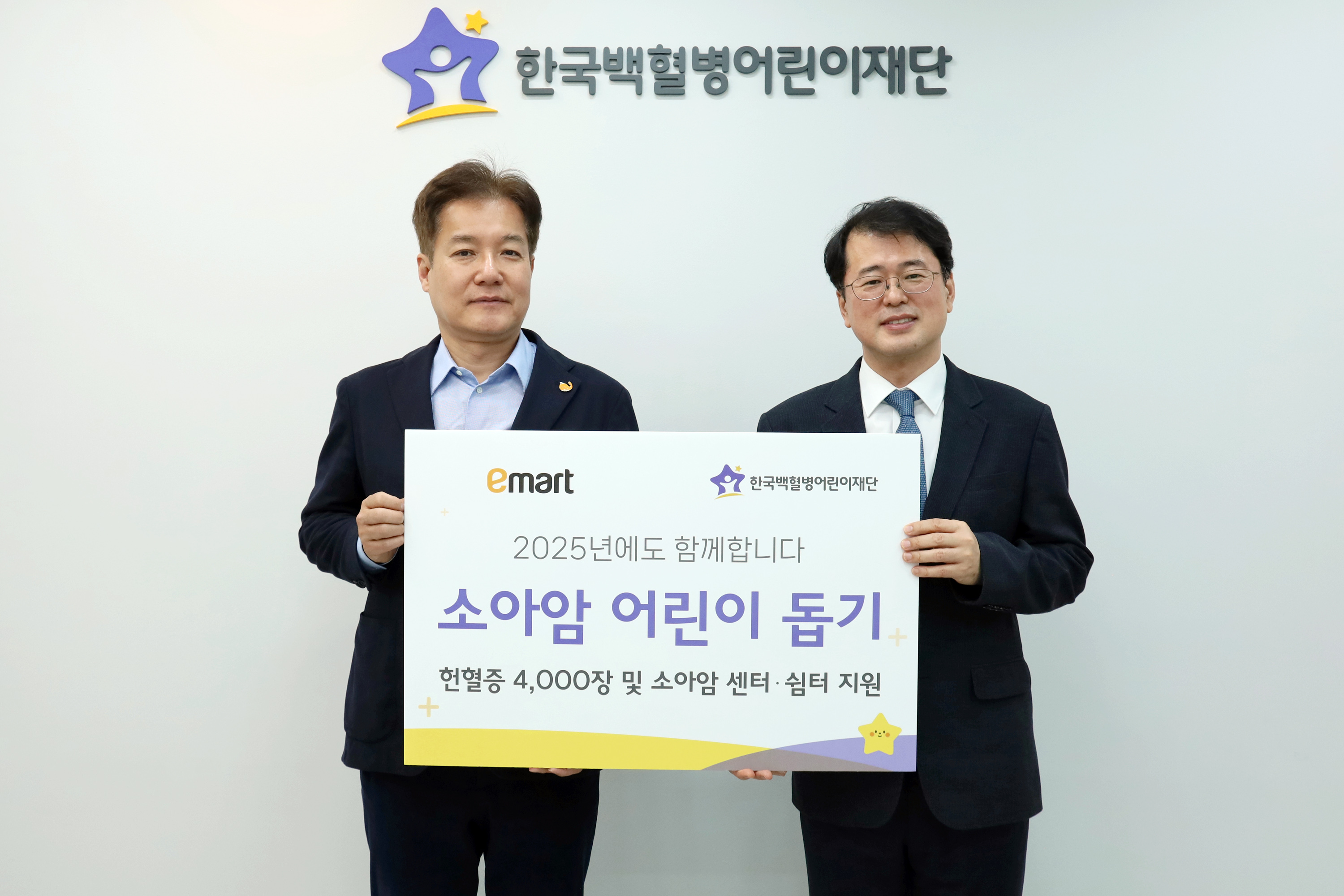 MEDIA 글자 크기 보통 크게 아주 크게 공유하기 페이스북 X 카카오톡 링크 복사 링크 복사됨 도구 보기 이미지 다운로드 이마트, 한국백혈병어린이재단에 헌혈증·후원금 기부 2025.03.27 이마트